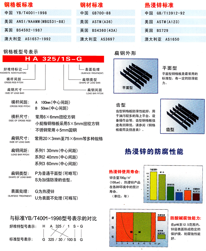 公司嚴格按中國GB700-88鋼材標準,鋼格板YB/T4001-1998標準生產,產品符合美國ANSI/NAAMM(MBG531-88)、英國BS4592-1987、澳大利亞AS1657-1985標準。